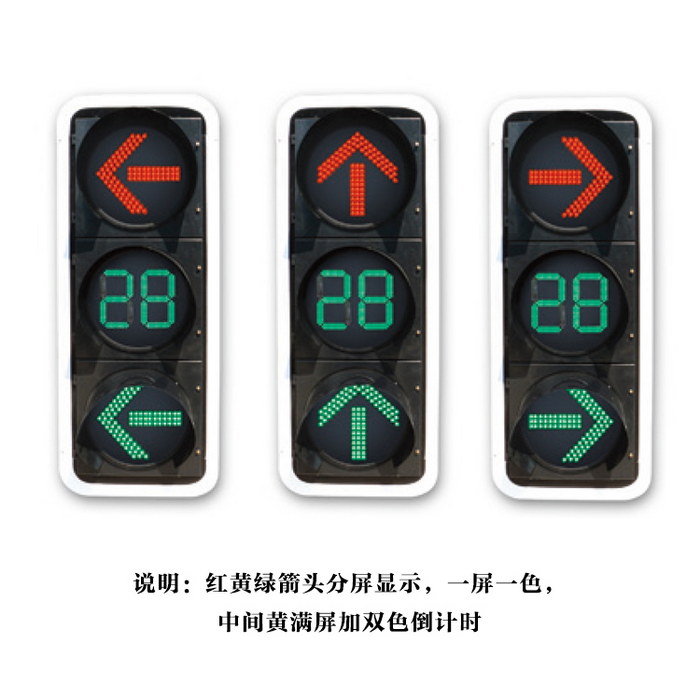 产品特点 光源采用进口超高亮度LED。灯壳采用一次性铝压铸或工程塑料注塑成型,灯盘发光面直径为300mm、400mm。灯体可任意组合和横竖安装。箭头灯为一灯三色,倒计时为双色。各项技术参数均符合中华人民共和国道路交通信号灯GB14887-2011标准。本信号灯适用于各种大、中型路口。